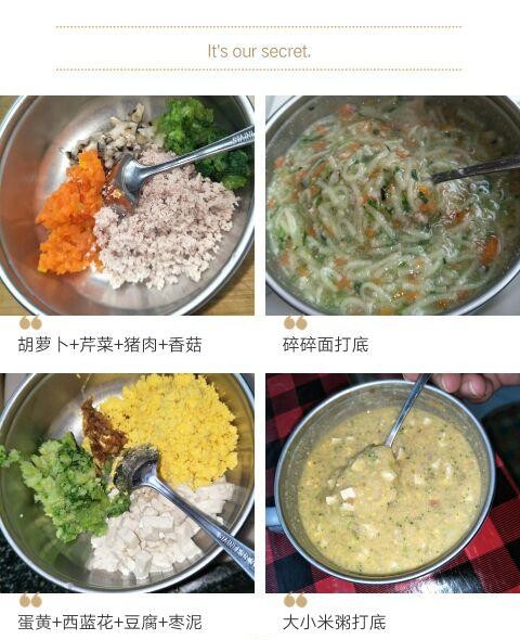 一般是:粥+菌类菜和叶菜+蛋黄+小半粒红枣泥+核桃油+芝麻猪肝粉或海苔粉