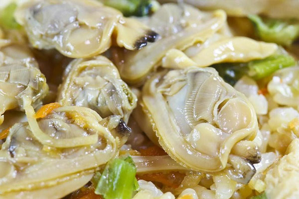 3、放入芒果贝大火翻炒;炒至芒果贝微微张口,烹入料酒继续翻炒1分钟;