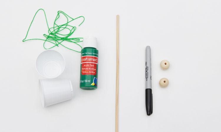 纸杯,带孔木珠,绳子,木棍,热熔胶枪,颜料和画笔,马克笔