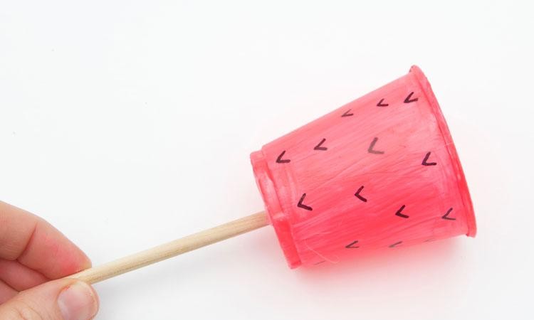 在杯子的底部戳一个孔,插入一个木棍,用热熔胶将其粘牢。