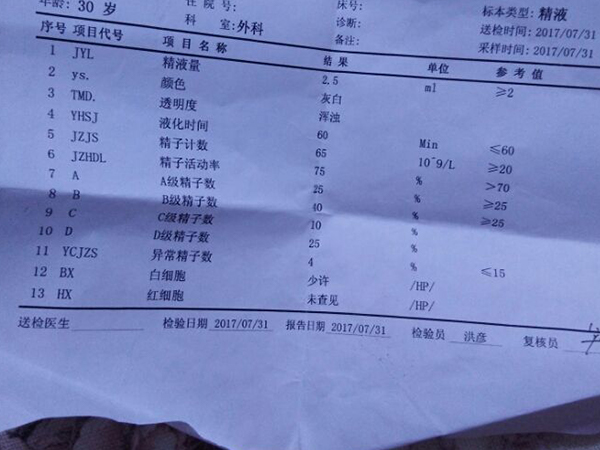 | 4 | 精子计数 | 1500万/ml |
