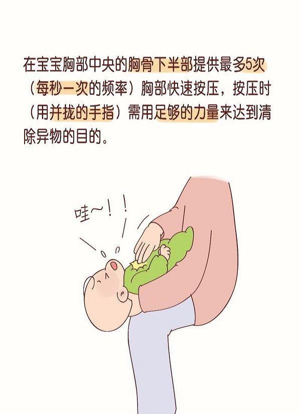 1、重复最多五次拍背和最多5次胸部快速按压的程序,直到异物清除或宝宝变得有反应。