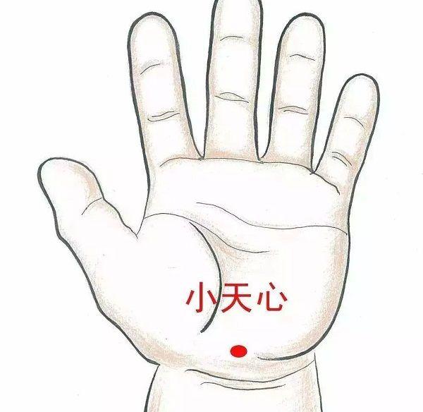 穴位:小天心穴位在手掌面大鱼际和小鱼际交接的凹陷处,这个穴位比较好找,让宝宝小指螺纹面和拇指螺纹面相贴,立马就可以看见凹陷。