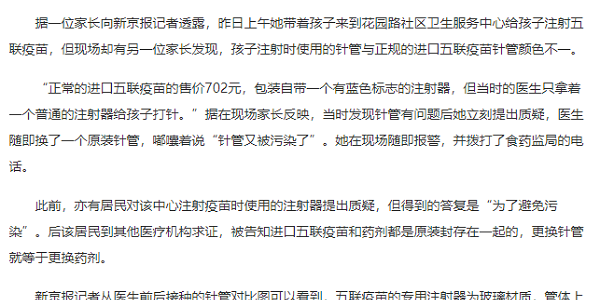 其实在此前,亦有居民对该中心注射疫苗时使用的注射器提出质疑,但得到的答复是“为了避免污染”,后该居民到其他医疗机构求证,被告知进口五联疫苗和药剂都是原装封存在一起的,更换针管就等于更换药剂。