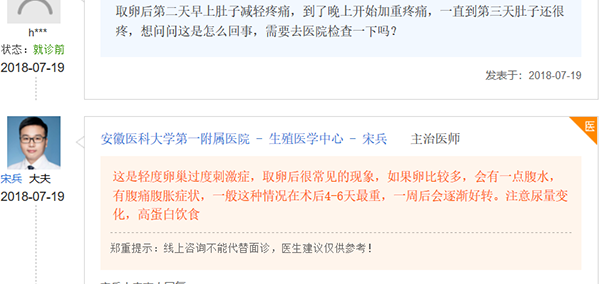 不过的话,取卵后腹部疼痛也要考虑是卵巢嵌顿、腹水、引导感染以及肠胃功能障碍导致,所以出现取卵后腹痛的姐妹们可以先到医院做进一步诊断,明确腹部疼痛的原因。
