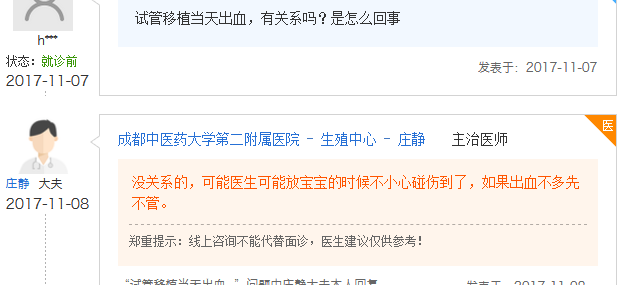 其实在网络上很多做试管婴儿的准妈妈都有相似的经历,也会发出“有没有试管移植当天出血的”和“试管移植后当天有出血怎么办”的疑问,以下就整理了一些大家的回答,如下: