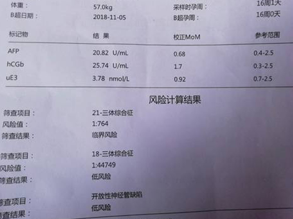 3、临界风险:风险系数在270与1000之间,介于低风险和高风险之间,一般检查出这个临界风险需要做无创dna进一步确认,一般90%以上是没问题的。