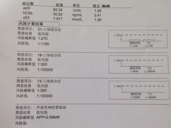 而唐筛两项就是通过孕妇血清中AFP和hCG的含量,结合孕妇的年龄,体重,孕周计算的胎儿患21三体综合症的风险值。临界值为1/275,大于为高危,小于则为低危,不论是AFP还是hCG,都是反映的女性孕期的发育情况,每个人都不一样,跟胎儿是男是女无关。