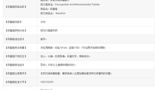 药品名称 妈富隆 MARVELON 通用名称 去氧孕烯炔雌醇片 2-25℃避光干燥处保存 性状 本品为白色片 短效避孕药 费用 30-60元 1X21片/盒,3X21片/盒 禁忌症 血栓疾病、心肌梗塞、严重高血压、子宫内膜增生 避孕 副作用 恶心、腹痛、头痛、乳房胀痛、体重增加、阴道分泌物异常 口服,月经周期第一天服用,每日一片 说明书 放置于药品包装内 36个月 批准文号 进口药品注册证号:H20130491 进口药品注册标准:JX20030103随着妈富隆在全球范围内的广泛使用,该药品现在不仅仅用于避孕,还有调经止血的功效,那么它该怎么用?每次用量是多少?停药或漏服妈富隆之后会影响到避孕效果吗?要继续服用应该怎么用?那么大家随着小编的解答一起来看看吧。