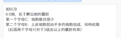 囊胚6cb中“6”代表的是孵出的囊胚,这里指的是已经处于孵出期的囊胚,然后“c”和“b”主要是对内细胞团和滋养层细胞进行质量分级。