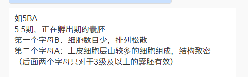 囊胚5ba中“5”代表的是正在孵出的囊胚,这里指的是已经处于正在孵出期的囊胚,然后“b”和“a”主要是对内细胞团和滋养层细胞进行质量分级。