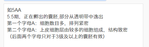 囊胚5aa中“5”代表的是正在孵出的囊胚,这里指的是囊胚的一部分从透明带中逸出,然后“a”和“a”主要是对内细胞团和滋养层细胞进行质量分级。