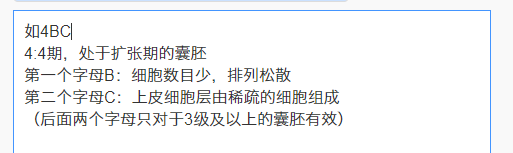 而这里的4bc囊胚中的“4”代表的是正处于扩张期的囊胚,而后面的“b”和“c”则是代表内细胞团数目少,排列的也松散,并且滋养层上皮细胞层由稀疏的细胞组成的。