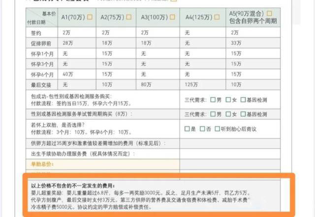 据她介绍,她所在的机构推出65万元和90万元两种代怀生子套餐,前者无法确保婴儿性别,后者则可指定性别。两种套餐均可分期付款,保证能在两年内向客户交出健康宝宝,否则全额退款。