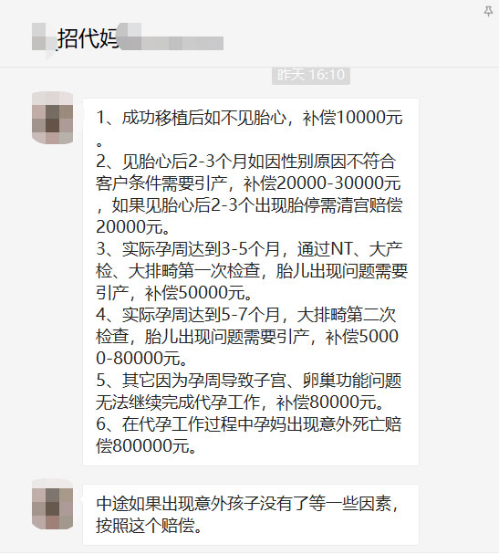 一则代怀生子妈妈招聘启事显示,如中途流产最高赔偿8万。