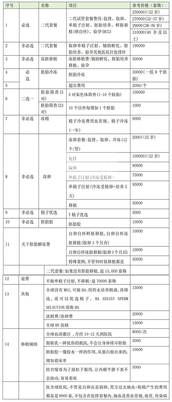 泰国全球生殖中心试管费用明细表
