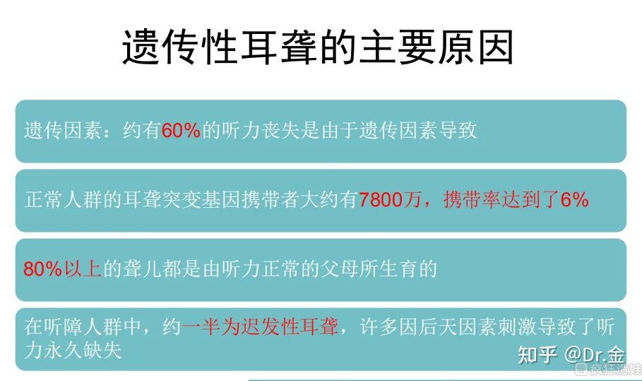 在我国,每1000名新生儿中就会有1名重度听力丧失患儿,其中大多数属遗传性耳聋患儿。有研究表明耳聋的主要病因是遗传和环境,其中遗传因素占比高达60%的耳聋,称为遗传性耳聋。
