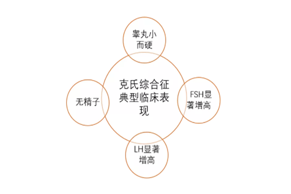 克氏综合征的主要临床表现为睾丸小而硬,无精子,促卵泡激素(FSH)、促黄体生成素(LH)显著升高。部分患者出现男子女性乳房化、性功能障碍。不同时期患者表现出来的症状不同,比较难以辨认。