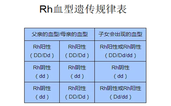 规律1、Rh血型的遗传符合孟德尔定律,孩子的染色体50%来源于爸爸,50%来源于妈妈。其中,Rh基因位于第1对染色体上,而决定ABO血型的基因位于第9对染色体上,和Rh基因相互独立,这也就说明,不管你是A型、B型、AB型或者是O型,都有可能是Rh阴性血。