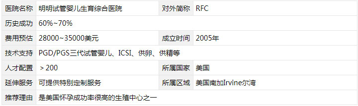 RFC生殖中心又叫明明试管婴儿中心,该中心是一家2005年成立的试管婴儿生殖中心,位于美国的南加尔湾,该中心成立的时间年限虽然不长,相比很多美国著名的试管机构来说名气也不是很高,但是该中心的试管成功率确实极高的,据统计历史成功率可达60%以上,在试管技术领先的美国也是名列前茅。