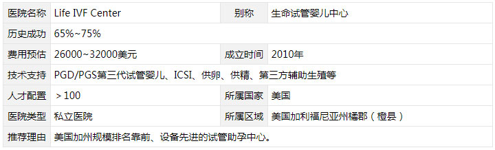 Life IVF Center(生命试管助孕中心)位于美国加州,是当地规模排名靠前的一家试管生殖中心,该中心设备先进,技术成熟,经验丰富,并且试管以微刺激试管方案为主,适合卵巢功能不佳以及高龄不孕群体,对女性身体的伤害较小,对于很多大龄女性来说,该中心再合适不过。