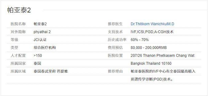 帕亚泰2国际医院于1987年7月正式成立,坐落于Phaholyothin路943,该院拥有着世界一流的试管婴儿技术(IVF)中心、领先的肾病诊疗和专科神经病学中心,历年来有不少国人远赴泰国到这里进行治疗。