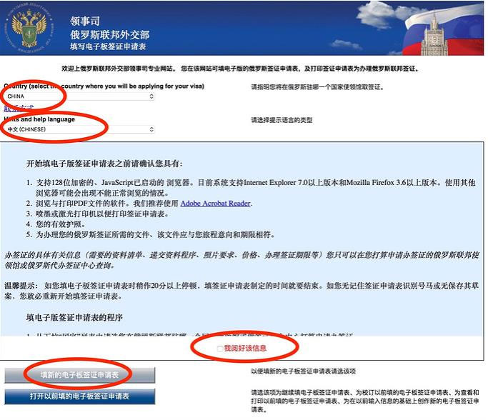 罗斯签证申请表填写网址(https://visa.kdmid.ru/PetitionChoice.aspx)刚才通过各大领事馆页面已经引导到这里来了。国籍选择CHINA,语言选择中文,在下面的我阅读好了打勾,然后选择填写新的电子版签证申请表。