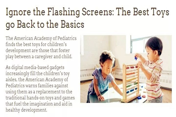 美国儿科学会科普网站healthychildren.org关于玩具选购方面,则直接给出了“忽略闪烁的屏幕,最好的玩具还是返璞归真”的标题。