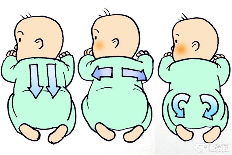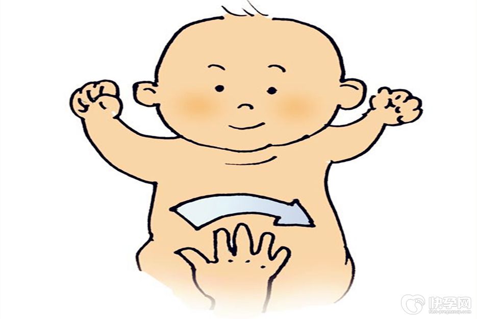 将右手指腹放在新生儿腹部右下方,沿顺时针方向做圆弧形滑动,左手紧跟右手从右下腹部沿弧形按摩,两手交替,避开脐部,动作重复4-6次。
