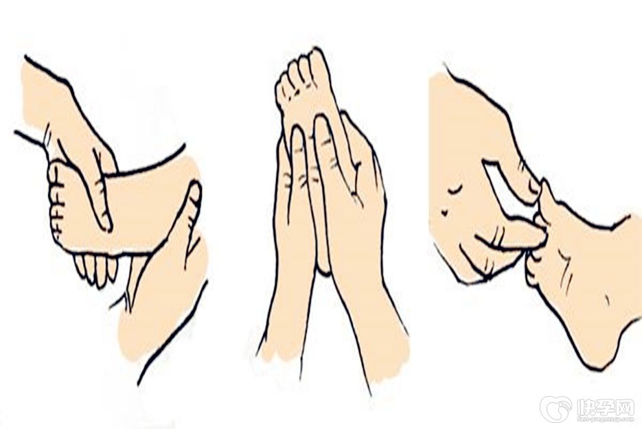 妈妈抬起宝宝的腿部,另一只手大拇指与四指分开,从宝宝大腿根部开始按摩至足部,做4-6次,然后用大拇指按摩宝宝的脚底,用大拇指及食指轻捏宝宝脚趾尖。再更换至对侧,重复上述操作。