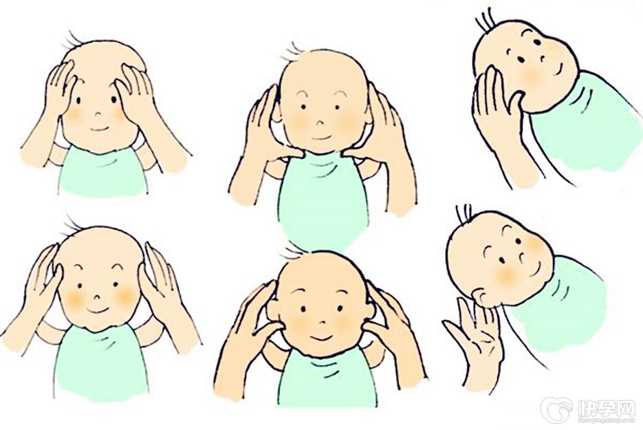 一手托住宝宝的枕部,使宝宝头偏向一侧,另一手食指、中指、无名指避开宝宝的囟门在宝宝头部侧面轻轻画大圈、中圈、小圈,做4-6次。再更换至对侧,重复上述操作。