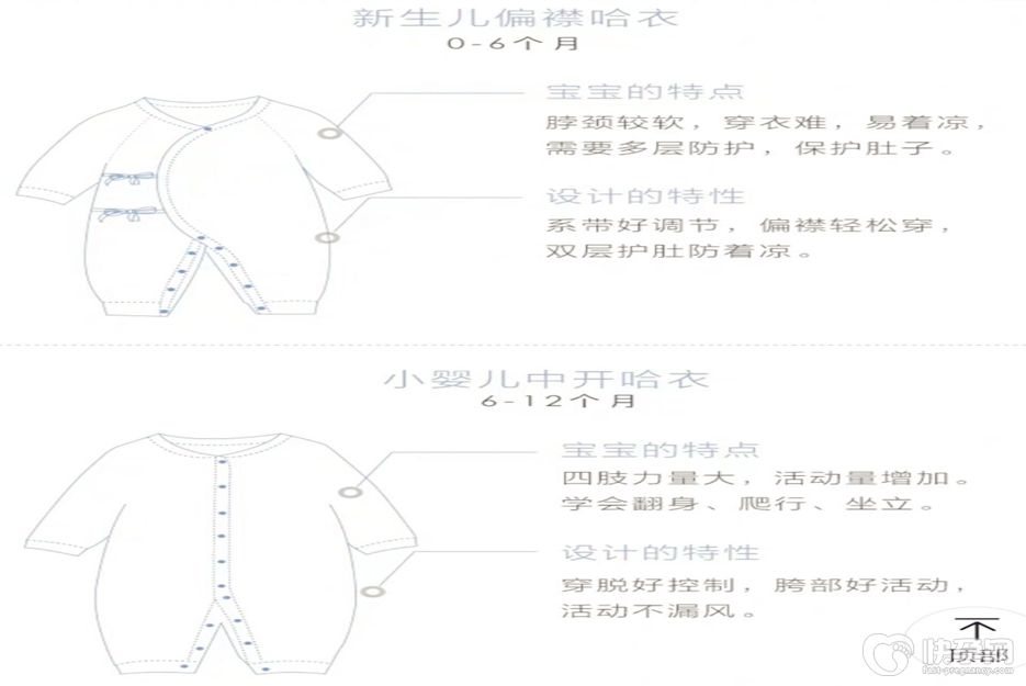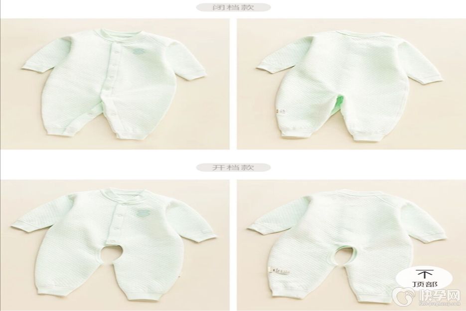 1爬爬服(普通连体衣):适用于俯趴、翻身、爬行时的宝宝。最好不要选择纽扣在正中间的衣服,长时间俯趴时宝宝会被纽扣膈应。斜纽扣和斜襟则比较安全,他们的纽扣或带子在衣服侧面。
