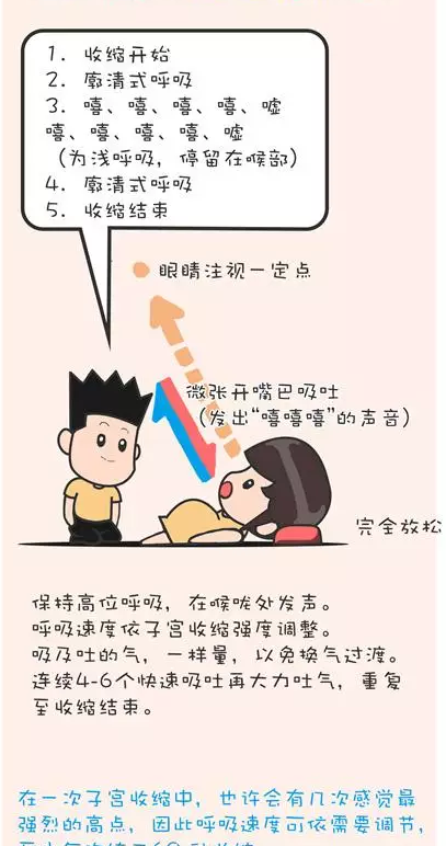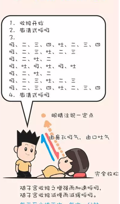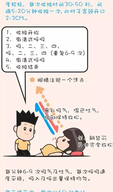 阶段方法步骤宫缩开始及结束时深呼吸每次宫缩开始及结束时,各做一次深呼吸。子宫颈约开0~3公分时慢速呼吸陶式呼吸,鼻子吸气,嘴唇噘起慢慢吐气,肌肉记得放松,每分钟约6~9次。子言颈约开4~6公分调整式呼吸3秒钟一-次,口诀: 1-2-Hee; 1-2-Hee ; 1-2-He子宫颈约开7~ 10公分节律式呼吸1秒钟1次,口诀: Hee-Hee-呼。子宫颈约开7~ 10公分直呼法1秒钟1次,要诀:呼-呼-呼。看过拉梅兹呼吸法教学视频的人不难发现,它主要是由放松和呼吸技巧两大部分组成,通过针对呼吸方式的练习,以达到生产时缓解疼痛,增加自信避免慌张的作用。