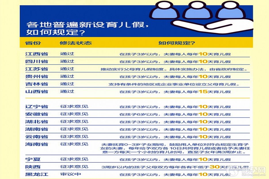 育儿假政策最给力的可能是陕西省和安徽省。陕西拟规定,3周岁以内的孩子父母双方每年各有不低于30天的育儿假。而安徽的征求意见稿将育儿假扩大至6周岁以下的孩子的父母双方每年各10天。10月26日,安徽省条例征求意见已经截止,具体如何规定,仍有待安徽人大常委会的最终决定。陕西省的征求意见截止日期为11月27日。