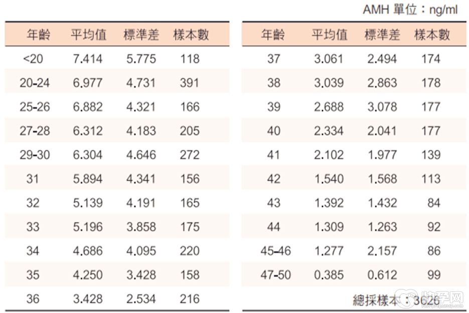 amh的水平会随着年龄增加而降低,到停经时就会检测不出来。女性要注意自己的卵巢功能,20到40岁的育岭女性,更需要了解自己的卵巢功能,检查amh是女性健康最重要的一环。近年来,有专家收集了三千多位台湾女性的amh数值,统计如下表: