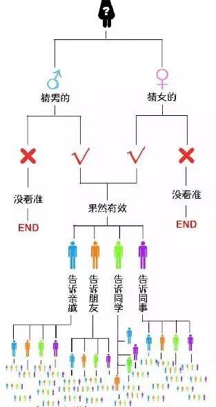 这张图是不是很明显,是否是这么回事?到了最后都是我一个亲戚,我一个朋友,事实上这就是一个概率问题,包括我们的清宫图也是一样的,就拿小编来说,我是不准的,我身边的朋友很多人也不准,但是也确实有准的,我们再看看下面的图片:是不是很多人都算过?其实跟上面的概率问题是一样的;