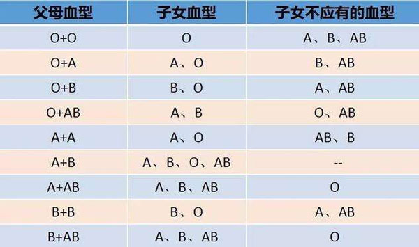 血型亲子鉴定对照表