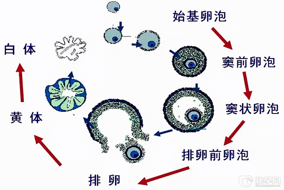 卵泡的发育始于始基卵泡到初级卵泡的转化,始基卵泡可以在卵巢内处于休眠状态数十年。始基卵泡发育远在月经周期起始之前,从始基卵泡至形成窦前卵泡需9个月以上的时间,也就是270天。