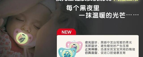 顾名思义“夜光型”最大的特点就是有夜光的设计,此款只有初生型适合0-6个月的宝宝使用,同样也采用了食品级的材质和贴心防尘盖设计。
