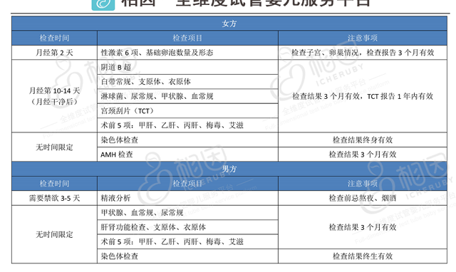 通过初次面诊要求的一些检查后,如果判断可以进行试管婴儿周期的夫妻,医生就会要求双方把以下检查项都做完了,看过结果之后医生才给制定方案安排进入试管婴儿的周期。