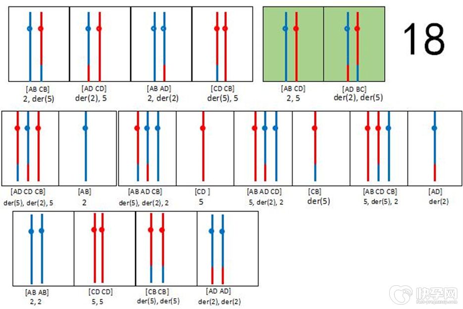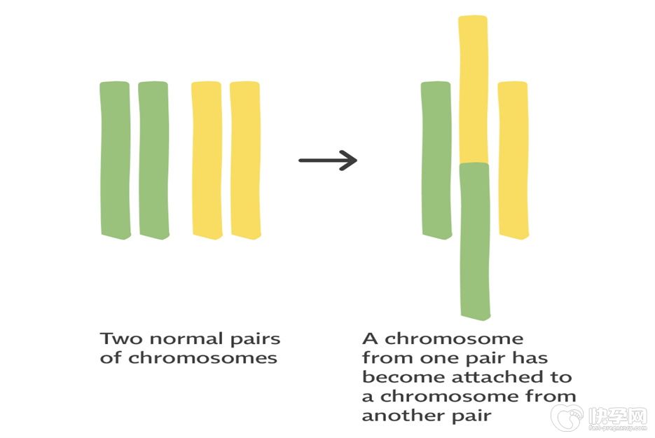 例如配偶中一方为2号和5号染色体间的平衡易位携带者。 即携带者细胞中具有一条正常的2号染色体,一条正常5号染色体,同时具有一条衍生的2号和5号染色体。由于配子形成的减数分裂过程中,同源染色体带段将相互配对,因此,在第一次分裂中期将形成平衡易位型的四射体。根据经典的遗传规律,理论上至少可形成18类型的配子,分别与一正常配子结合,则至少可形成18种合子而其中仅一种为正常,一种为表型正常的平衡易位型携带者。