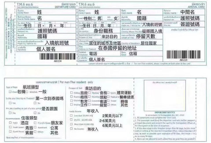 泰国入境卡正反面(图片来源于网络)