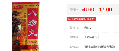 东医生八珍丸200丸/瓶6.60元 唐龍八珍丸48粒x4板/盒6.80元 佛慈八珍丸200丸/瓶8.70元 天水岐黄八珍丸360丸/瓶13.00元 扶阳八珍丸10颗/瓶6.00元从上面的八珍丸价格表来看,不同品牌的八珍丸价格不但不一样,不同规格价格也会不一样,除此之外地区不同八珍丸的购买价格是否也会有变化呢?这里我们一起来看看各地网友怎么说:
