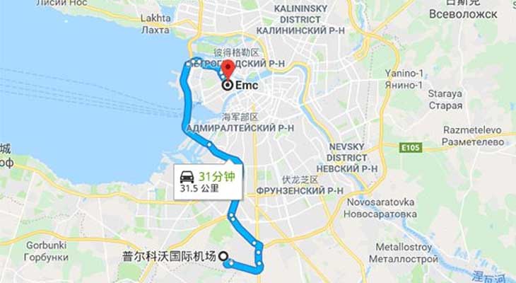 到达EMC医院首先得到谢列蔑契娃国际机场,而EMC医院距离谢列蔑契娃国际机场大概28.5公里,通过地铁、公交以及出租车均能到达,用时大约在一个小时左右。