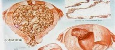 (3)卵巢黄素囊肿 葡萄胎患者由于大量HCG的刺激,双侧或一侧卵巢往往呈多发性囊肿改变。一般不产生症状,偶有急性扭转致急腹痛。葡萄胎清除后黄素囊肿可自行消退。黄素囊肿可贮藏大量HCG,故葡萄胎排出后合并有巨大黄素囊肿的患者,血和尿HCG消失比一般患者慢。