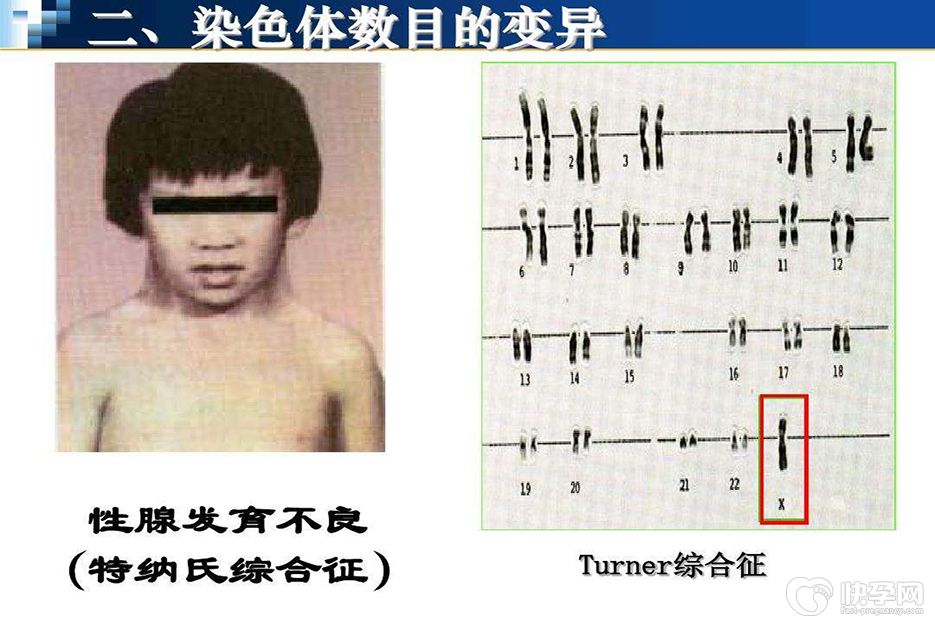 嵌合型特纳综合征是一种由于X染色体缺失或结构异常所致的染色体异常性疾病。正常女性有2条X染色体,但Turner综合征患者其中的1条X染色体出了问题。一类是临床中最常见的X染色体缺失(即核型45,X,约占50%),这些患者体内的细胞仅含有一条X染色体。还有一类患者属于嵌合型,意思是人体内有一部分细胞是X染色体缺失,而另一部分细胞染色体是正常的。另外还有一部分患者的X染色体数目正常,但结构发生了改变。根据染色体病变的程度不同,患者发生第二性征不发育及不孕的表现也是轻重不一的。据统计约20-30%患者可以和正常同龄人一样青春发育,2%可月经来潮,1.8-7.6%的可以自然生育,但其中仅有30-40%的人可以生出健康的宝宝。