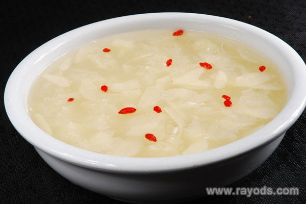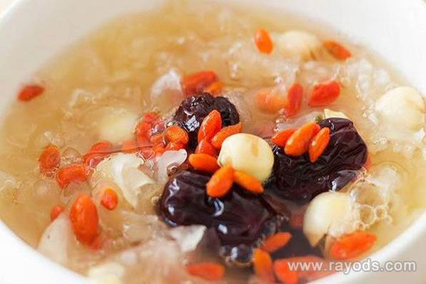 做法:将所有食材提前放入清水中浸泡,浸泡好后将银耳撕成小块,红枣去核切成小块,然后将准备好的食材放入锅中,先用大火烧开后转为小火慢慢煲制,直至汤煮成粘稠状后加入适量的冰糖和枸杞,继续煮制5分钟后即可起锅。