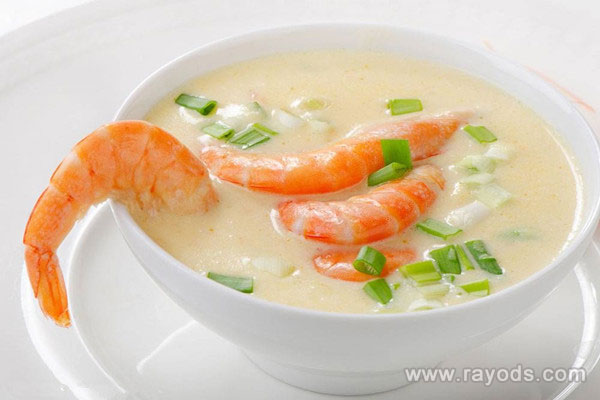 做法:将大米洗净后用清水浸泡两小时,新鲜的虾去掉虾壳和虾线洗净备用,同时将芹菜洗净后切成小丁状;准备一个煮锅将大米放入锅中用大火煮开,撇去多于的浮沫后转为小火,当粥煮至粘稠时将虾仁和芹菜放入锅中,再加入适量的食盐调味即可。