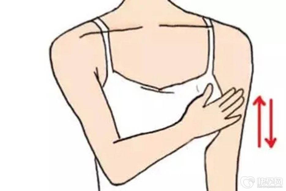 先用右手掌面在左侧乳房上部,即锁骨下方施力,均匀柔和地向下直推至乳房根部,再向上沿原路线推回,做20—50次后,换左手。