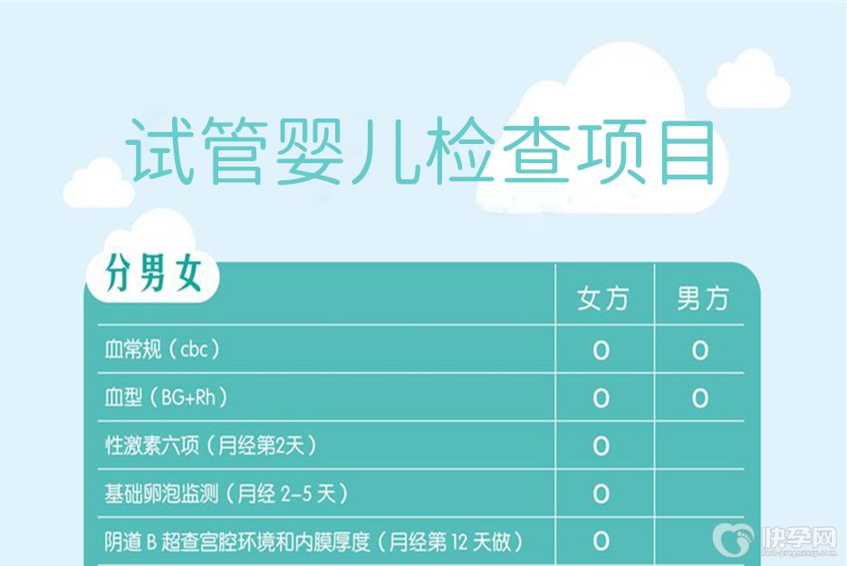 检查包括单纯疱疹病毒抗体Ⅰ、单纯疱疹病毒抗体Ⅱ、巨细胞病毒抗体IgM、巨细胞病毒抗体IgG、风疹病毒抗体IgM、风疹病毒抗体IgG、弓形虫抗体IgM、弓形虫抗体IgG,避免病毒感染影响后续试管婴儿的顺利进行,因为感染病毒不仅可能导致试管婴儿失败,还可能导致流产、胎停等现象。